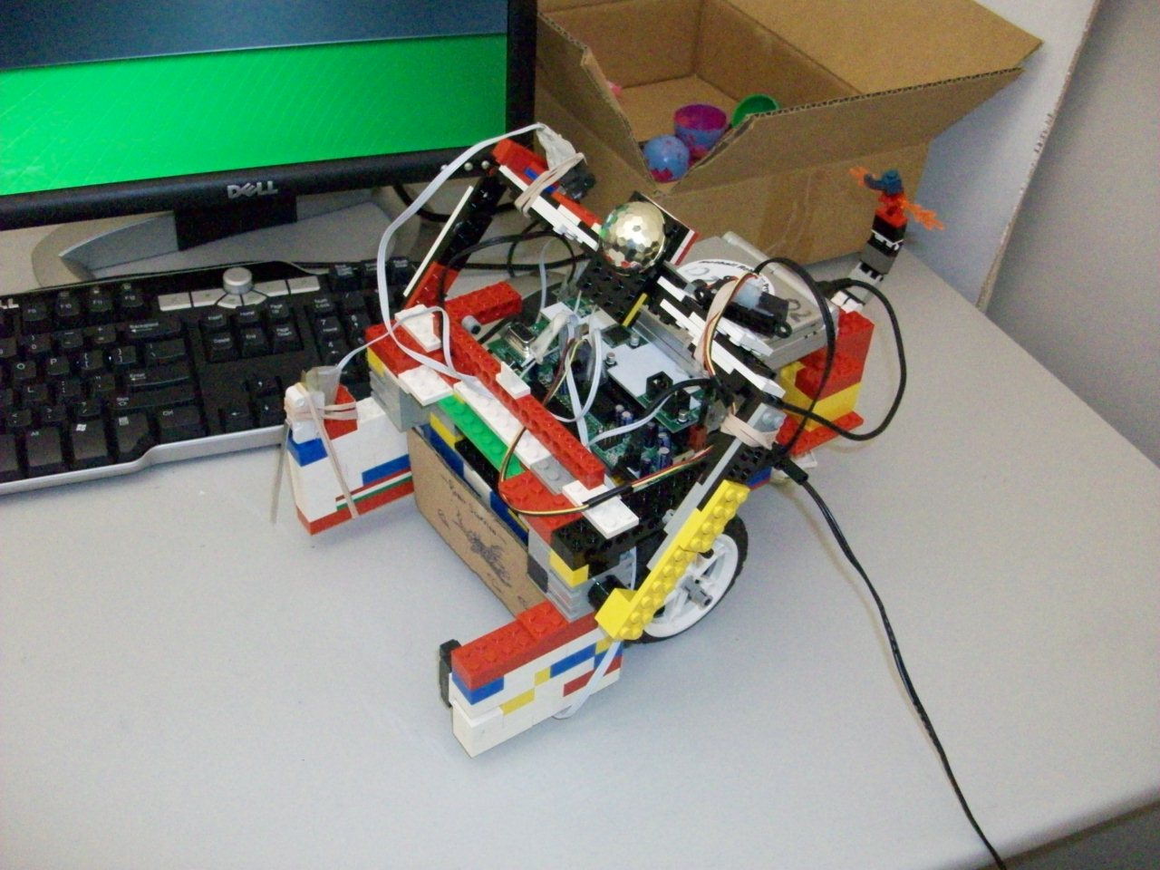- This project involved our robot using a small camera on the front of it to detect color blobs as it wandered around a PVC pipe arena. The goal was to locate the blue eggs, move toward them, somehow contain them (our robot drops an arm in front), look around to find the correct goal (there are two differently colored goals), move them to the goal, release the egg(s) there, and repeat. Alternatively, the tennis balls are worth negative points, and one could design a robot to find those and put them into the opponent’s goal.